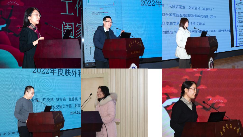 大会第一部分,由耿松梅主任开场致辞,对各位院领导对莅临表示热烈的欢迎和衷心的感谢,其后,由王晓鹏副教授、刘彦婷博士、程传涛博士、贾金花护士分别就皮肤病院医疗、学科建设、皮肤外科、护理等工作进展做了简要汇报,2022年,在院领导的支持下,在科委会的引领下,皮肤病院全体同仁齐心协力、乘风破浪、砥砺前行,克服重重困难不断奋进,在医疗、教学、科研、学科建设及护理等多个方面都取得了长足的进步。