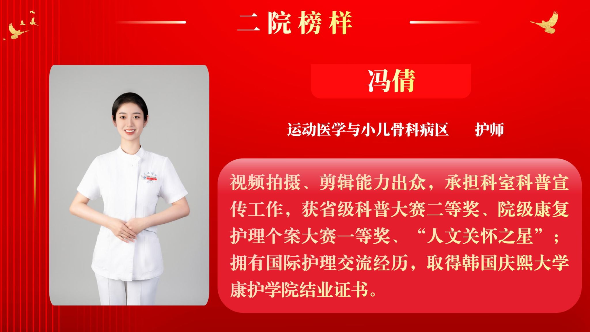 仰望星空有对标,脚踏实地有行动,平凡的是岗位,不凡的是精神。此次“二院榜样”月度人物共评选出8名,他们分别是:肿瘤内科主管护师马莉、急诊科副主任护师王丽娜、运动医学与小儿骨科病区护师冯倩、甲状腺外科助理研究员何巧、老年综合内科住院医师张秀丽、老年普通外科住院医师高志峰、风湿免疫科住院医师崔晓光、核医学科住院医师彭艳。