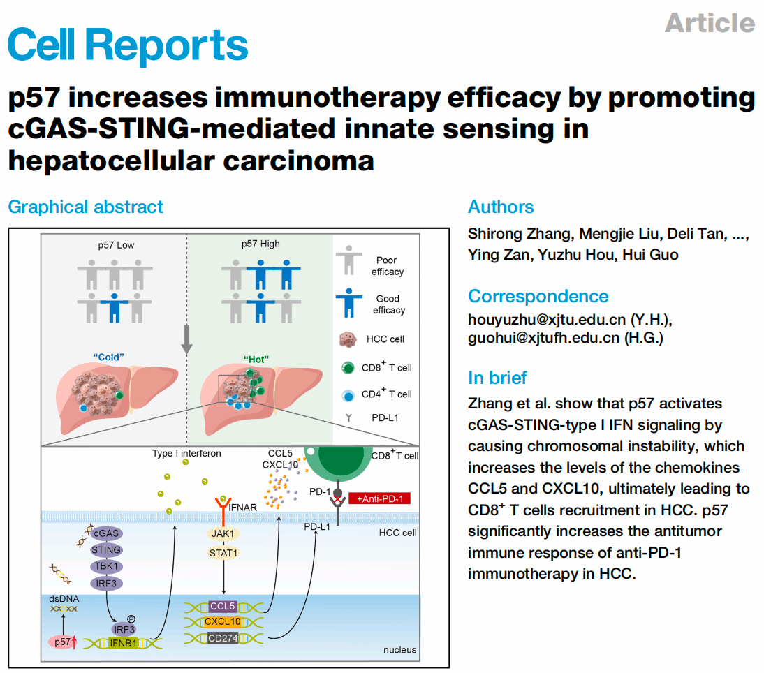 新年伊始,我院郭卉教授研究团队在 Cell Reports上发表了题为 “p57 increases immunotherapy efficacy by promoting cGAS-STING-mediated innate sensing in hepatocellular carcinoma” 的重磅研究。该研究系统揭示了细胞周期抑制蛋白p57在肝癌(HCC)免疫微环境重塑及免疫检查点抑制剂疗效调控中的关键作用,为HCC的免疫联合治疗提供了新的分子靶点与理论依据。通讯作者为郭卉教授,侯玉柱教授。