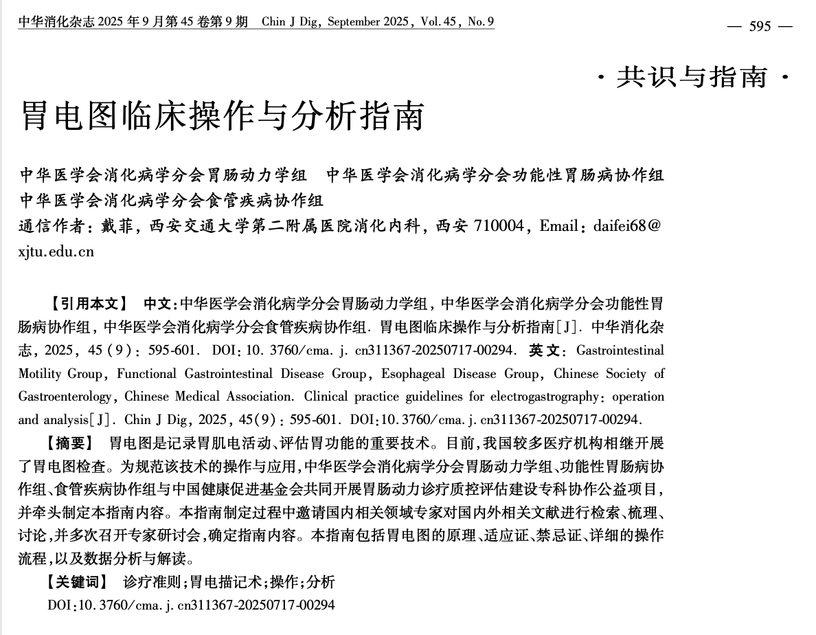 胃电图作为一种无创记录胃肌电活动、评估胃功能的重要检查手段,近年来已在我国多家医疗机构逐步开展,并在功能性消化不良、胃轻瘫等胃动力障碍性疾病的诊断与疗效评估中展现出重要价值。然而,由于长期缺乏统一的操作流程和分析标准,不同中心在检查实施和结果解读方面存在较大差异,制约了该技术的临床推广和研究应用。