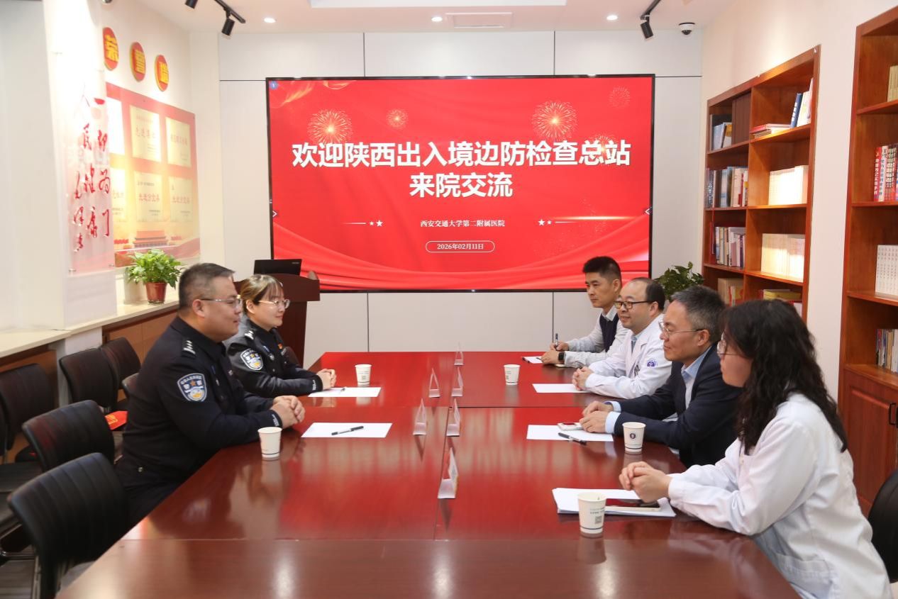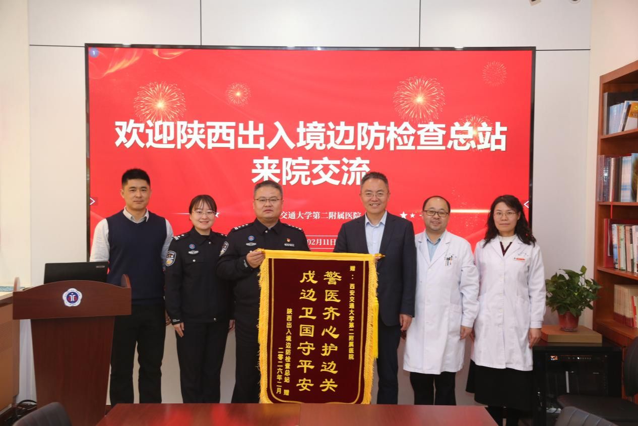 2026年2月11日下午,陕西出入境边防检查总站后勤保障处副处长惠海军一行来到西安交通大学第二附属医院,专程赠送锦旗,对我院在戍边民警医疗保障合作中提供的优质服务表示衷心感谢。副院长刘明、医务部常务副主任王虎清、医务部副主任同艳妮等参加交流活动。