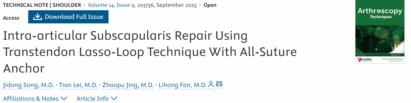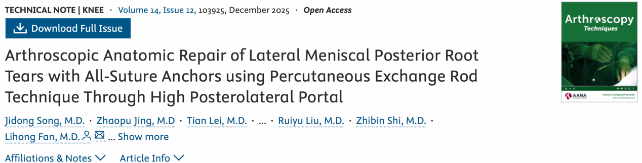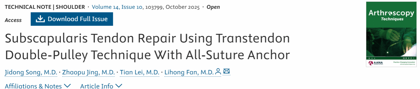 《Arthroscopy》是国际骨科与运动医学领域的顶尖学术期刊之一,其技术分刊《Arthroscopy Techniques》专注于全球前沿、可推广的手术创新方案,在国际关节镜外科领域具有重要学术地位和广泛影响力。系列技术的集中发表,不仅体现了我院在肩膝关节微创领域“持续创新、系统布局”的学科建设成果,也标志着我院运动医学团队在国际舞台上的学术影响力不断提升。