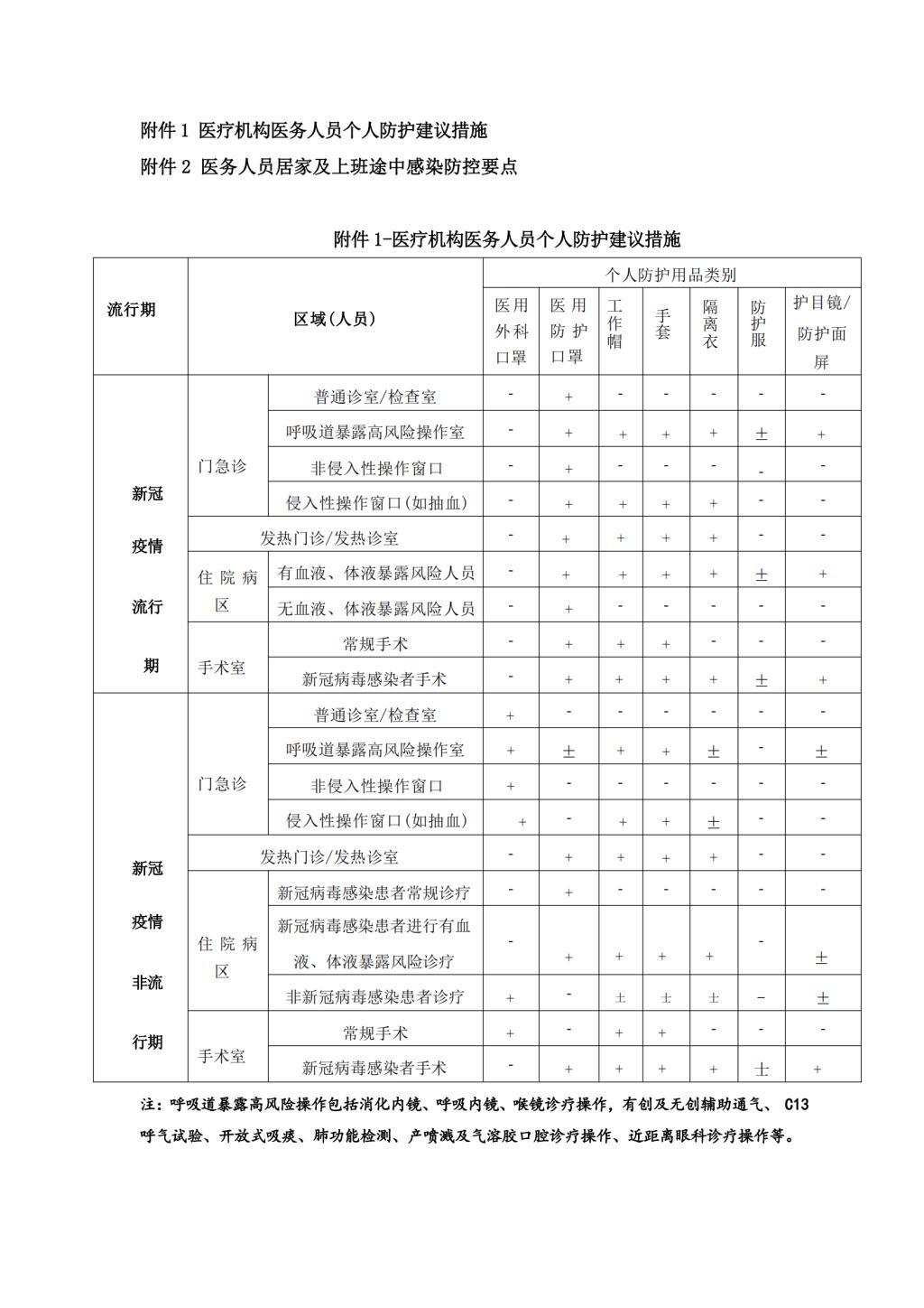 三、医务人员根据暴露风险做好个人防护,与新冠病毒感染者密切接触及进行喷溅性操作等高风险暴露时;或在隔离病区、发热门诊和新冠门诊等高风险诊疗区域。医务人员选择医用防护口罩、护目镜或防护面屏、医用隔离衣、鞋套(各类防护措施见附件1)。