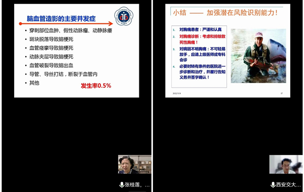 张桂莲主任讲解的题目为缺血性脑血管病的诊疗,就脑血管病的分类、早期识别、脑血管造影适应症及并发症、溶栓治疗、血管内介入治疗进行了讲解。高登峰教授围绕胸痛的诊断与鉴别诊断展开论述,致命性胸痛的病因很多,除急性冠脉综合征外,主动脉夹层、急性肺栓塞、张力性气胸、食道破裂等都可引发,如何鉴别显得尤为重要,加强潜在风险识别能力是关键。