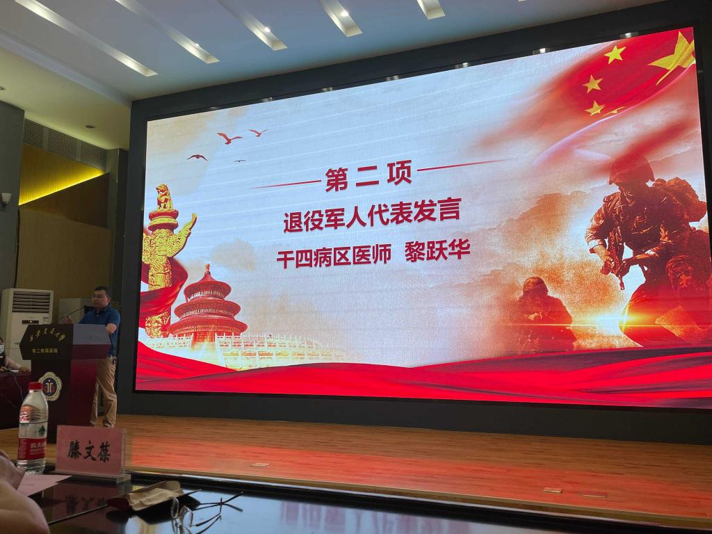 随后离退休退役军人代表郇宜让和在职退役军人代表、干四病区医师黎跃华与大家共同回忆和畅谈了军旅生涯的峥嵘岁月,无比幸福和欣慰于享受到党和国家对于广大退役军人的关怀和爱护,表示他们过去为军旗争光,现在要为医院争辉,要继续保持人民子弟兵不怕苦不怕累甘于奉献的好传统、好作风,不忘初心,勇担使命,为医院发展贡献自己的力量。