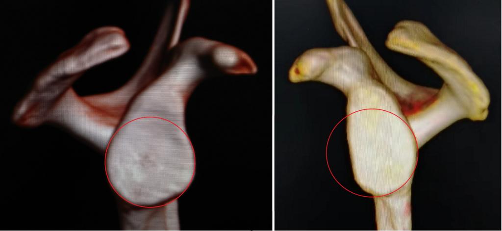 术前患者两侧肩盂CT对比,患者骨缺损超过20%