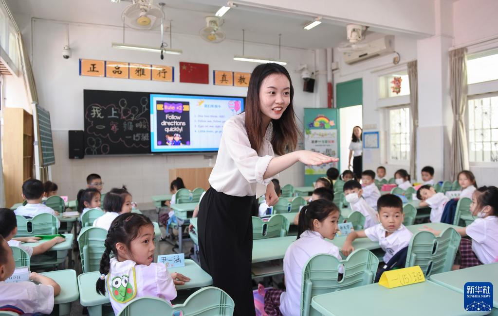 深圳市福田区南园小学教师、香港理工大学对外汉语教育专业硕士毕业的香港青年黄晓蕾在英语课上与孩子们互动(9月1日摄)。新华社记者毛思倩 摄
