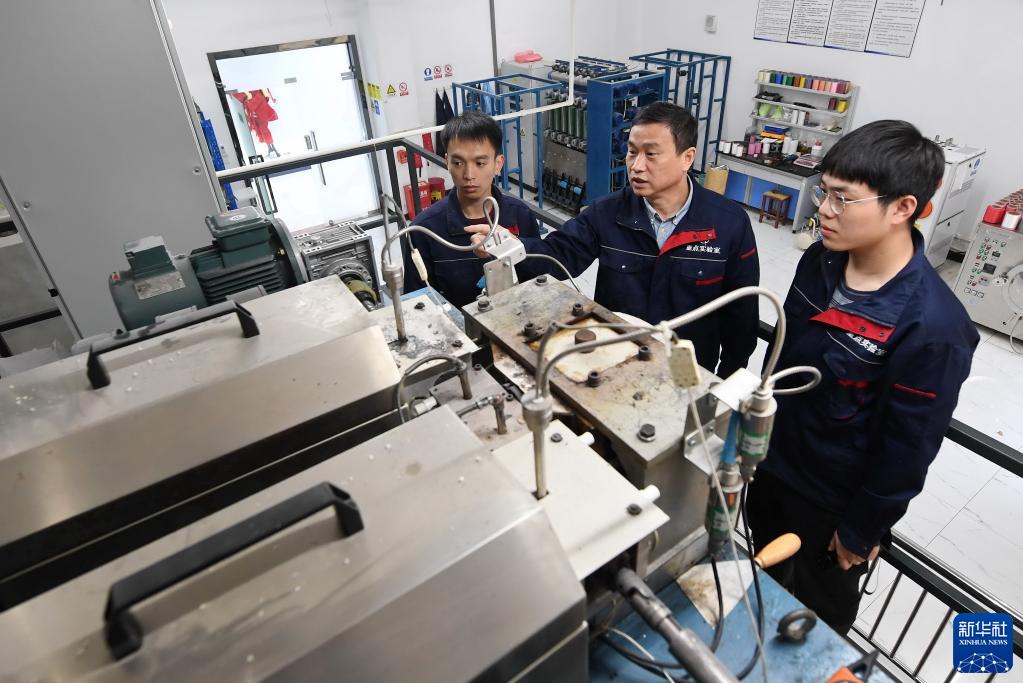 福建闽江学院服装与艺术工程学院教授李永贵(中)在“福建省新型功能性纺织纤维及材料重点实验室”教学生做纺丝实验(3月22日摄)。新华社记者林善传 摄
