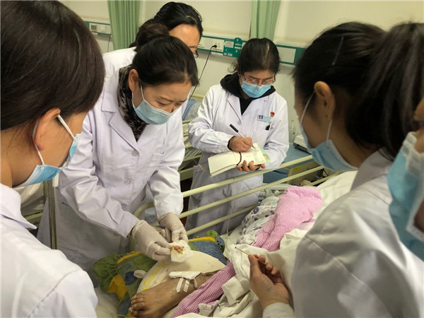 2020年10月13日下午,西安交通大学第二附属医院压疮伤口造口专科小组王金娟组长、陈娟组长、国际造口伤口治疗师宋美利副主任护师、压疮伤口造口专科小组联络员韩艳等成员来到西安市碑林区第三爱心护理院,为院区的患者,特别是长期卧床、糖尿病及老年患者等查看皮肤问题,指导患者压疮、伤口疑难问题。