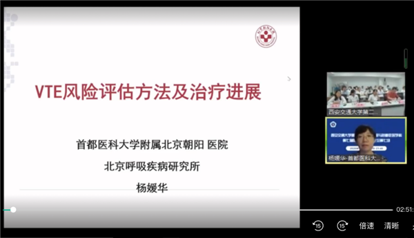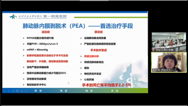 肺血管疾病专场,中华医学会呼吸病学分会肺栓塞学组副组长、中日友好医院翟振国教授从循证医学证据及临床实践出发,深入讲述了肺栓塞抗凝治疗疗程及长期管理策略;中华医学会心血管分会肺血管病学组副组长、西安交通大学第一附属医院周围血管科主任田红燕教授就慢性血栓栓塞性肺动脉高压的药物、介入及外科手术治疗进行了详尽介绍;中华医学会呼吸病学分会肺栓塞学组委员、首都医科大学朝阳医院杨媛华教授从VTE风险评估方法、预防措施及治疗进展方面进行了精彩报告;我院呼吸与危重症医学科杨侠教授系统性地阐述了D-二聚体在VTE诊治中应用;王蕾医生则向大家展示了一例SLE相关性肺动脉高压病例,引发了线上专家的精彩互动。