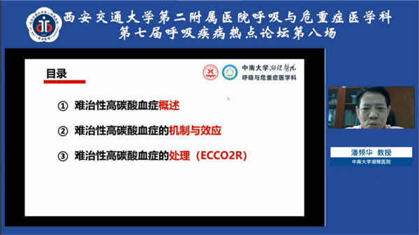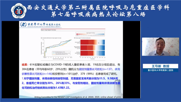 呼吸重症专场,中华医学会呼吸病学分会委员、重庆医科大学第二附属医院王导新教授就糖皮质激素在流感、SARS、ARDS及新冠肺炎中的应用进行了详细讲解;中华医学会呼吸病学分会危重症学组副组长、中南大学湘雅医院潘频华教授讲授了顽固性高碳酸血症发生的病理生理机制,并介绍了体外CO2清除和ECMO在此类患者救治中的优势;中华医学会呼吸病学分会呼吸治疗学组副组长、危重症学组成员、四川大学华西医院梁宗安教授讲述了毛细血管渗漏的发生机制,并从原发和继发两个方面介绍了相应的诊治方法;中华医学会呼吸病学分会委员、河北医科大学第二附属医院阎锡新教授结合临床实践病例,阐述了床旁超声和HRCT在危重症患者诊治中的重要作用;我院呼吸与危重症医学科方萍教授结合最新研究进展,就重症患者炎症因子风暴的发生、识别及处理做出了精彩报告;我院呼吸与危重症医学科宁璞医生分享了一例重症肺炎伴发脓毒血症及多器官功能障碍的临床案例,强化了危重症患者救治中细致、规范开展临床工作的重要性。