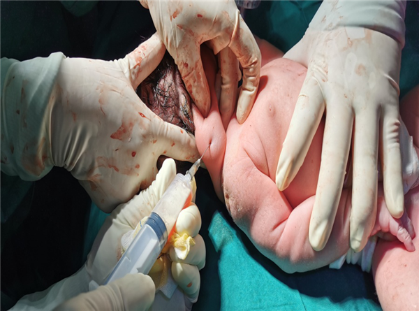 李小鹏教授反复探查微创路径,确定穿刺方法,8:00手术正式开始,由于胎儿脐带绕颈一周,且囊腔内有分隔,穿刺难度较大,李小鹏教授和王华主治医师严密配合,经孕妇腹壁、子宫壁,避开脐带,穿刺针精准进入颈部淋巴囊肿内,为克服囊腔内分隔干扰李小鹏教授不断调整穿刺针角度,最终抽得淡黄色清亮液体约46毫升,囊腔明显缩小,手术顺利,术后胎儿心率平稳,脐血流指数正常。即刻行剖宫产术,邬晋芳教授及段钊教授主刀,小儿外科高亚教授、新生儿科王慧萍教授、麻醉科雷晓明教授以及手术室赵丽燕护士长等多学科专家密切配合,行产时外科手术,于胎儿娩出后继续穿刺抽吸颈部淋巴囊肿囊液约10ml,断脐后顺利拔除气管插管。新生儿哭声嘹亮,各项生命指标评分良好,产妇手术顺利,母子平安。