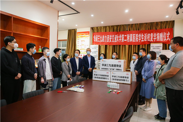 5月9日上午,华润三九医药股份有限公司助力我院学生返校复学捐赠仪式在“党员之家”召开。院党委副书记滕文葆、总会计师李文博、中医科主任吴喜利教授、党慧敏教授、安鹏教授,学工部主任吕晔、国装办王磊及4名学生代表参加了捐赠仪式。