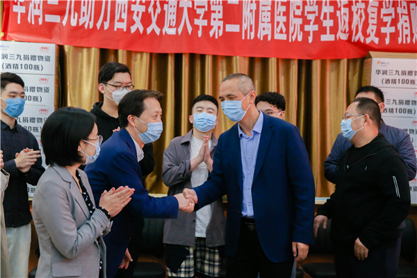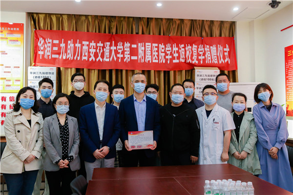 滕文葆副书记首先对华润三九表示衷心的感谢,他认为在这次新冠疫情中全社会众志成城,交出了一份满意的成绩单,他赞扬了华润三九的社会责任担当精神,倡导学生们学习这种社会责任,同时在使用这些物品的时候,也能够深切感受到“饮水思源”的意义,医学生是未来医疗服务行业的中坚力量,定要把这种精神体现在学业中,在今后的工作中用实际行动回馈社会。华润三九陕西区域总经理樊利军谈到,通过捐赠物品,希望让交大的学子感受到华润三九公司的温暖,感受到社会的关爱,有效传递华润三九高度的社会责任感和强烈的正能量。中医科吴喜利主任特别介绍了此次捐赠的中药预防方“正气散”是由全国老中医药两位专家指导中医科一同研发,他引用黄帝内经中“正气存内邪不可干”,解释了预防方具有辅助人体正气、预防疾病的作用,我院的中医药治疗手段在援鄂医疗队中得到了广泛使用,取得了一定效果,希望同学们切身体会祖国传统医学的博大精深和独特魅力。李文博总会计师为爱心企业颁发捐赠证书。学生代表也纷纷发言感谢华润三九公司对大家的关心与关怀,并表示绝不辜负广大爱心企业、爱心人士的期望,立志成长为卓越医学生服务大众健康。