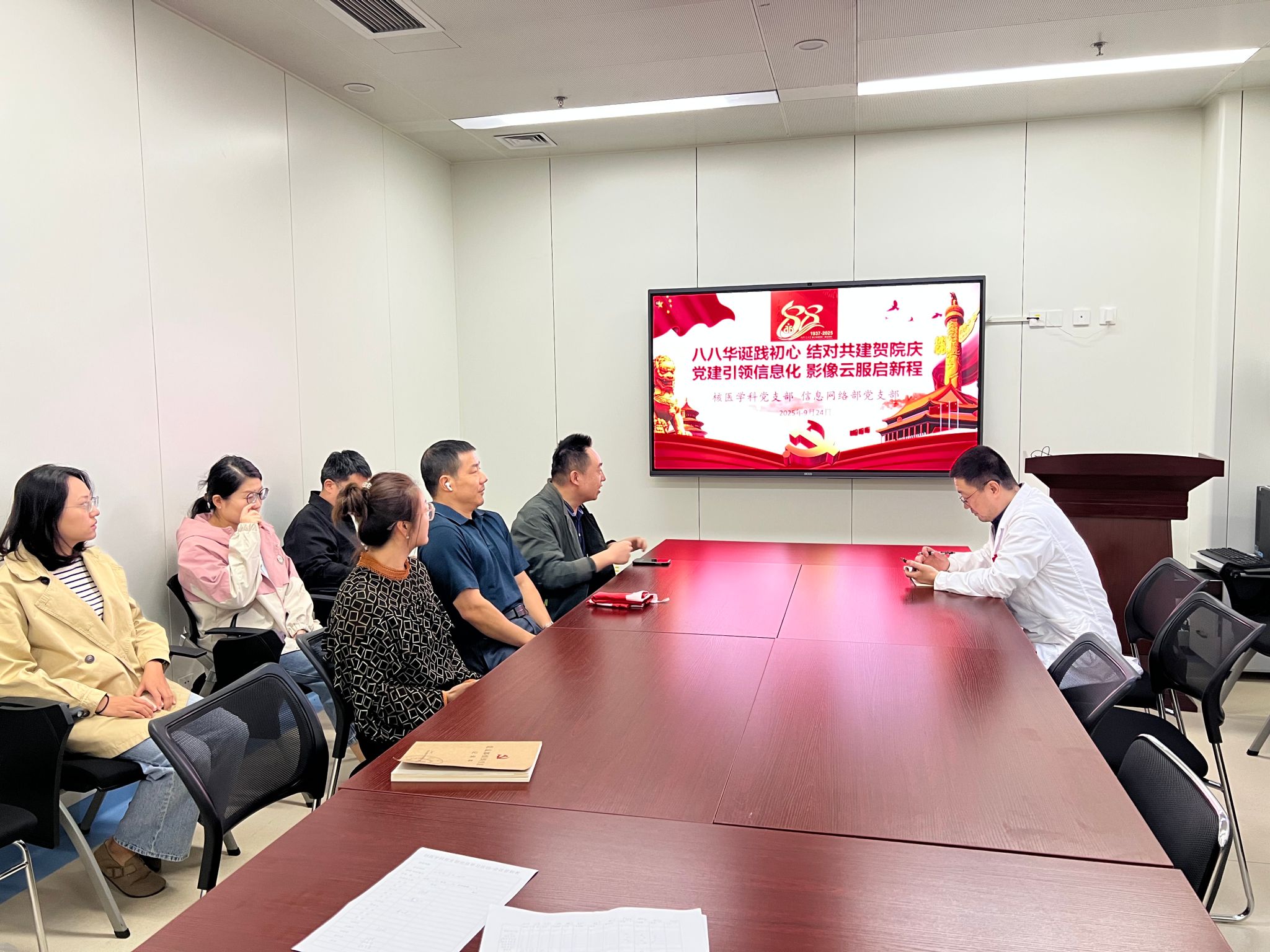 9月24日,为响应医院“八八华诞践初心”系列活动号召,推动党建与业务深度融合,核医学科党支部与信息科党支部围绕“八八华诞践初心,结队共建贺院庆;党建引领信息化,影像云服启新程”主题,举办了一场交流会议。此次会议聚焦电子病历评级工作,深度探讨日常信息网络相关问题,旨在提升医院信息化服务水平,以实际行动为医院88周年院庆献礼。