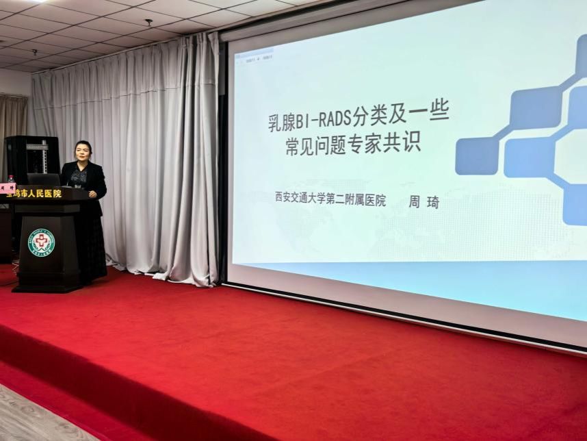 党支部书记姜珏教授围绕《超声介入常见并发症与注意事项》,从基层超声介入开展现状切入,讲解介入操作中常见并发症的早期识别方法及应急处理流程,着重强调无菌操作、术前评估、术后随访等核心环节的重要性,为基层安全开展介入超声提供了清晰的实操建议。周琦教授以《乳腺 BI-RADS 分类若干问题专家共识解读》为题展开授课,针对基层医师在乳腺结节诊断中常面临的分类边界模糊、漏误诊风险高等难点,系统梳理乳腺 BI-RADS 分类的诊断标准、影像特征及临床处理原则,帮助大家掌握分类逻辑。随后,马文琦副主任医师带来《胃超声 Su-RADS 在胃癌初筛中的应用》,介绍胃超声 Su-RADS 分级体系的建立背景、诊断标准及临床价值,并结合基层医疗机构设备条件与接诊特点,给出高危人群的超声筛查流程建议。最后,宝鸡市人民医院超声医学科副主任医师罗永科以《阴囊疾病的超声诊断及专家共识》收尾,作为当地专家,他深刻了解宝鸡地区基层医院在阴囊疾病诊断中的实际需求,通过常见疾病的超声影像对比,详细讲解各类阴囊疾病的典型征象、鉴别要点。授课环节结束后,基层医师们结合日常工作中遇到的诊断困惑积极提问,专家们结合临床案例耐心解答,将理论知识与实际问题深度结合,现场交流氛围热烈。课后还向参会人员收集基层医院技术需求反馈,为后续长期技术帮扶奠定基础。