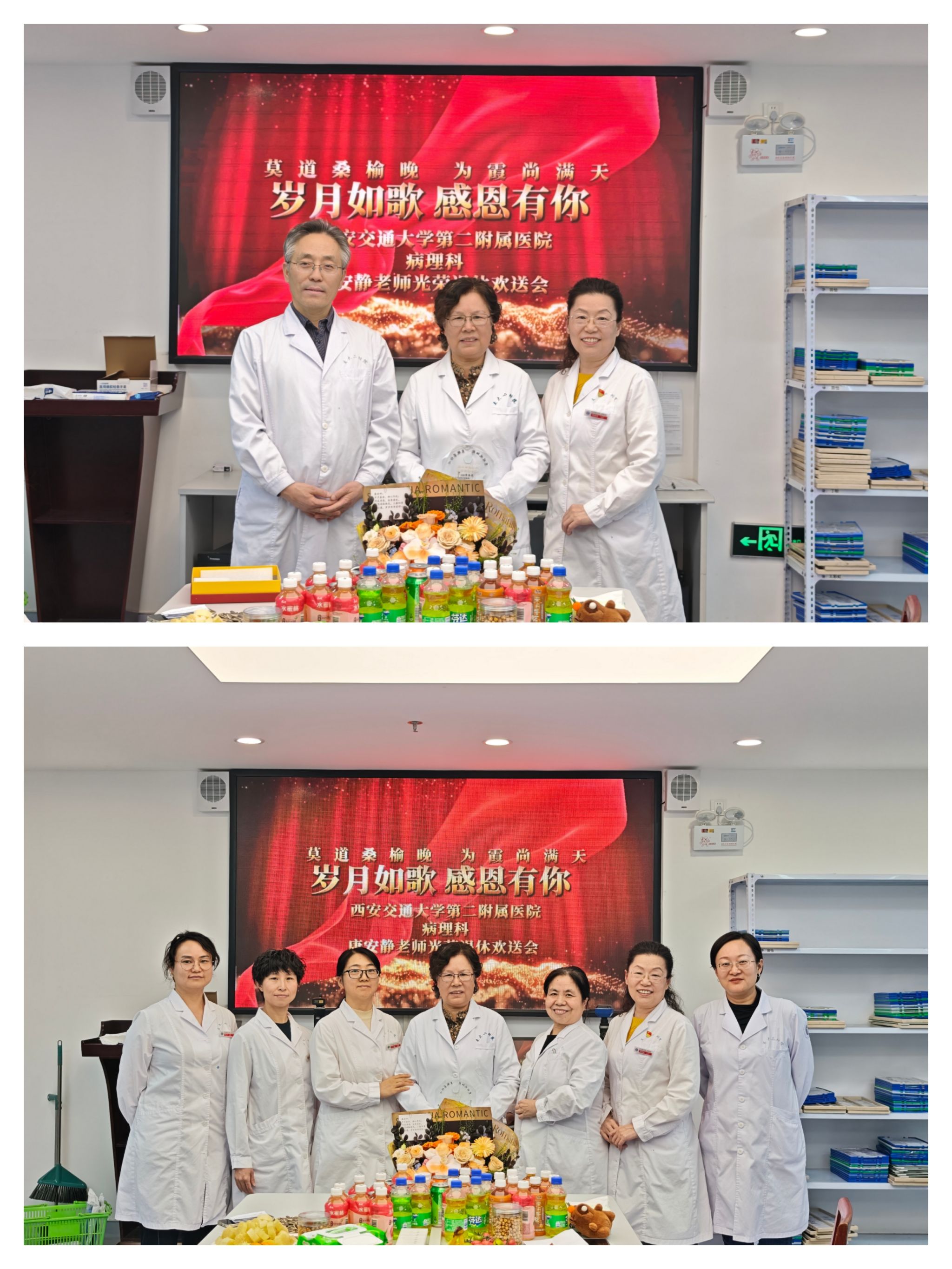 2025年12月30日,病理科举办元旦茶话会暨老员工荣休仪式。杨军主任首先对全年工作进行了总结。2025年是病理科“质量管理年”,全面梳理了病理科质控和管理办法、SOP文件、病理报告规范等专业文件,在医疗、教学、科研及优质病理资源下沉和社会服务等多方面取得扎实进展。科室顺利经过三甲复审、国家卫健委大型医院巡查等,并积极搭建学术平台,主办了“2025年陕西省抗癌协会肿瘤分子分型专委会学术年会”、“肝脏及消化道病理诊断学术大会”、“细胞蜡块制备技术培训班(第2期)”、及学术沙龙等四次学术活动,促进了专业交流与提升。教学培训成果显著:住院医师规范化培训结业考核通过率保持100%,在省级住培教学病例讨论比赛中荣获团队二等奖等四项荣誉,成功承办陕西省临床病理科住培实践技能考试,教学秘书获评学年优秀。在优质医疗资源下沉和履行社会责任方面,在人员紧张的情况下,派出科室党支部书记兼副主任郭睿和病理技术骨干苏文秀支援新疆白鸟湖医院开科并开展术中冰冻工作,派技术组长靳耀锋支持延川县人民医院病理科开科并开展常规病理工作;接收韩城矿务局医院、府谷县人民医院病理标本,承接陕西中医医院术中冰冻等工作,切实推动优质医疗资源下沉。以理事长单位申报的组建陕西数智病理联盟获得批准,为未来提升病理业务水平和全省病理技术协作搭建新的平台。杨军主任也指出当前在科研和满足患者个性化需求方面存在的不足。