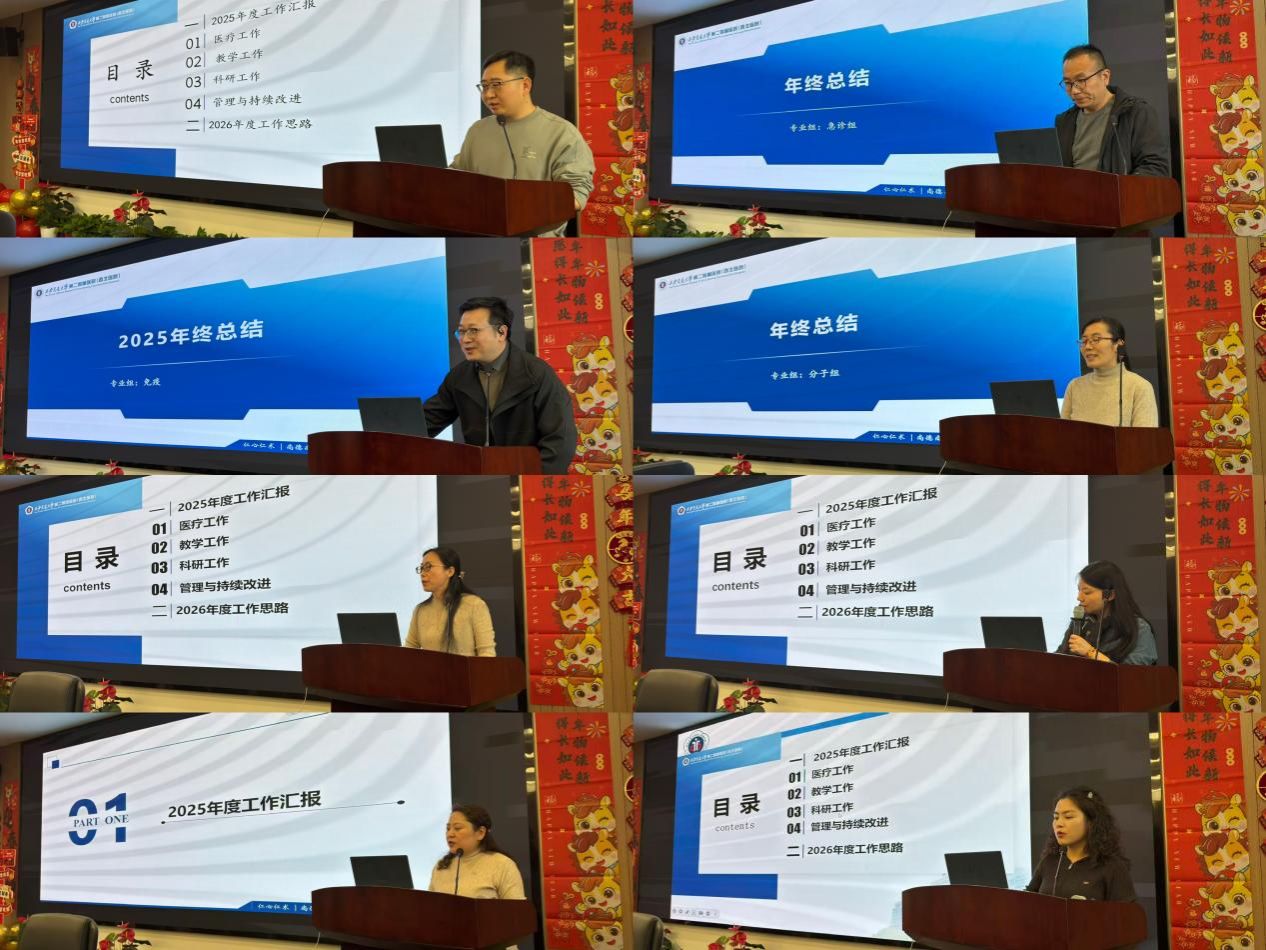 随后,何谦主任对2025 年度工作进行汇报总结。围绕医疗质量、教学培育、科研创新、人才建设及党建宣传五大核心板块展开:医疗方面,标本采集送检闭环流程全面优化,标本丢失率与差错率双双归零,并以优异成绩通过三甲复审、大型医院巡视等多轮重要外部评审;教学方面,作为省级生物安全培训基地,累计完成 8 期骨干培训班,接收省内外进修生 30 余名,住培考核工作圆满完成;人才与学科建设方面,依托 “强科行动”“育英计划” 培育骨干人才,成功承办省级学术会议并推进医工交叉国际合作;党建与宣传方面,深化 “党建 + 项目管理” 融合模式,开展系列公益活动与健康科普,发布科普短视频 10 余条。同时,明确 2026 年核心任务,包括迎接 ISO15189 复评审、搭建二代测序平台、冲击国家级科研项目等,为学科高质量发展筑牢坚实基础。
