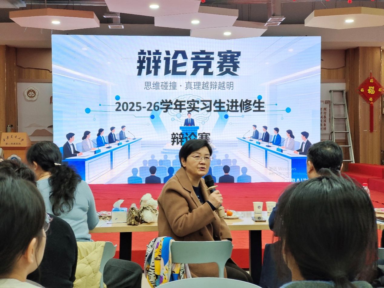 2026年2月9日下午,康复医学科于南院餐厅举办“2025——2026年度康复实习进修生辩论竞赛”活动。来自在陕西中医药大学、西安医学院、商洛学院、西安体育学院、延安大学创新学院、西安交通大学城市学院、西安思源学院、新疆科技学院、广州新华学院等9所院校的43名康复治疗实习学生分成6队进行了竞赛角逐。本次竞赛由康复医学科马奔治疗师长总体负责,治疗师组教学秘书胡冰涛、付培甲具体策划实施,全体治疗师积极配合,旨在检验康复治疗师团队半年来的教学工作,以赛促学,以赛促教。实习学生团队通过康复辩论竞赛,展示各自的实力与智慧。在比赛中运用专业知识展现“思维碰撞·真理越辩越明”。