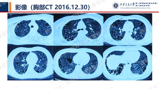 血气分析:pH 7.453,pCO2 35.6mmHg,pO2 67.4mmHg,SO2 93.9%。肺功能提示混合性通气功能障碍(FEV1/FVC 69.04,FEV1%pred 35.3),弥散功能减低,支气管舒张试验阴性。心脏及腹部超声检查未见明显异常。全身骨骼X线片未见异常。