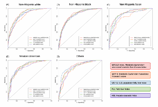 图12. 2017-2020年(疫情前)美国不同族裔人群中MAFLD指数、MAF-5、US FLI、FLI和HSI诊断代谢功能障碍相关脂肪性肝病(MAFLD)的受试者工作特征曲线下面积(AUROC)比较(A)非西班牙裔白人, (B)非西班牙裔黑人, (C)非西班牙裔亚裔, (D)墨西哥裔美国人, (E)其他族裔。