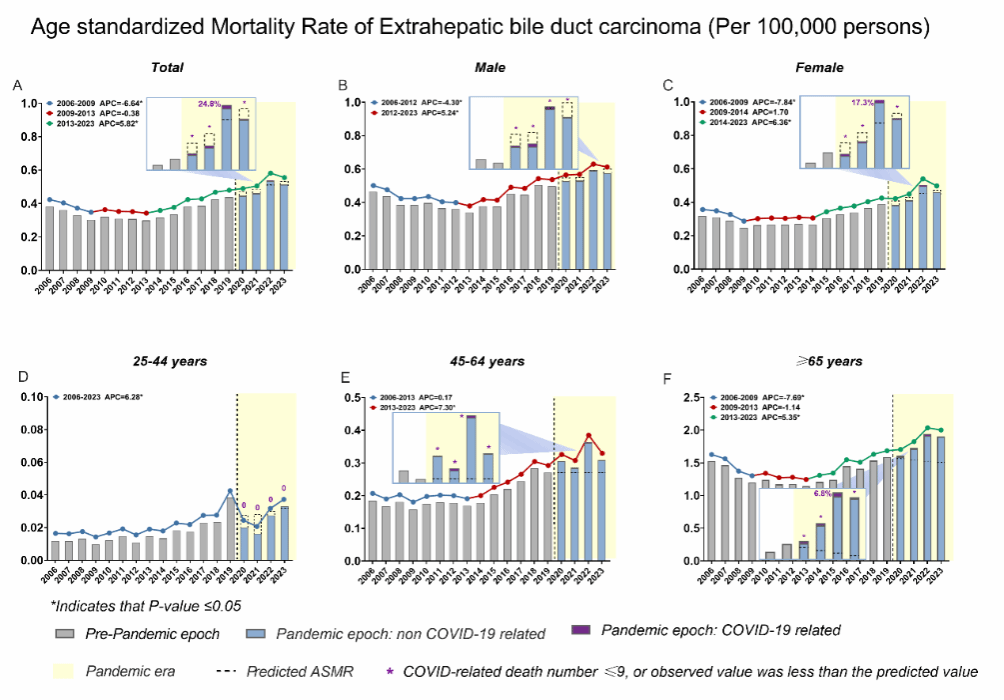 胆管癌是一种高度致死的恶性肿瘤,虽然HCC的死亡率趋于稳定,尤其是HBV/HCV相关的HCC明显下降,但胆管癌的死亡率的时间和空间趋势、不同年龄和性别亚组的差异尚不清楚。本研究旨在分析美国2006-2023年期间肝内胆管癌(ICC)和肝外胆管癌(ECC)相关死亡的年龄标准化死亡率(ASMR)趋势及新冠大流行对其ASMR的影响。