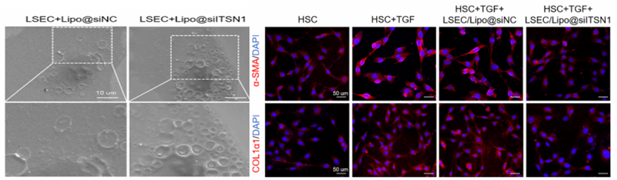 研究显示ITSN1是影响LSECs分化表型的关键分子,使用防御素递送的ITSN1siRNA靶向LSECs可恢复LSECs的窗孔结构,逆转肝纤维化。