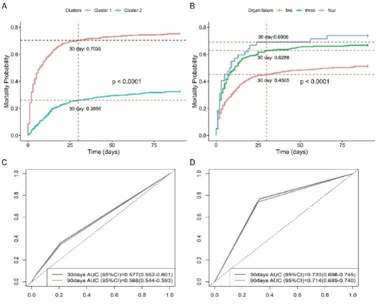 图12. 慢加急性肝衰竭患者的死亡概率分析以及30天和90天死亡率的预测性能比较