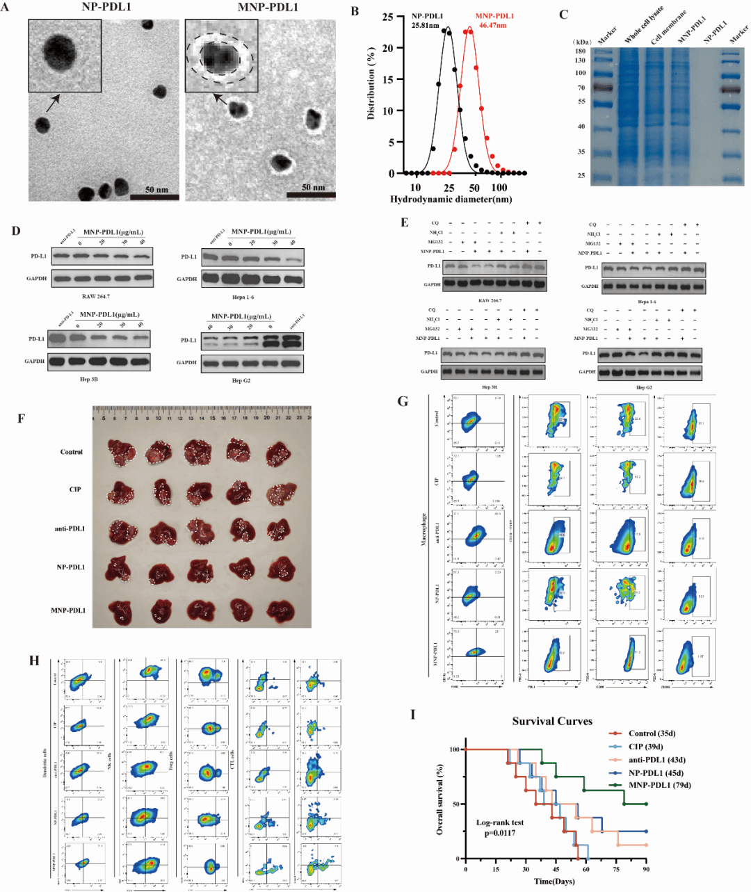 本研究使用溶酶体自噬系统结合仿生膜技术开发了一种仿生自噬降解肽(MNP-PDL1),该肽由PD-L1结合序列、PEG3接头和靶溶酶体伴侣蛋白识别序列(CIP)组成,可以将靶蛋白PD-L1定位到溶酶体进行降解。