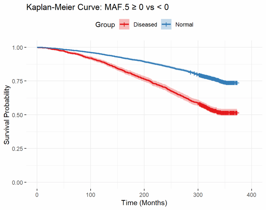 本研究筛查7942名参与者,最终纳入1645例MAFLD患者。在随访期间,共有630人死亡(38.30%)。Cox回归分析显示五种指数在识别高风险死亡人群的效能分别为:MAFLD指数最高(Hazard Ratio,HR 2.393,95%CI:2.203-2.599,P<0.001),其次是MAF-5(HR 2.336,95%CI: 2.142-2.547)、US FLI(HR 2.270,95%CI: 2.085-2.470)、FLI(HR1.899,95%CI:1.748-2.062)和HSI(HR 1.160,95%CI: 1.067-1.262)。MAFLD指数和MAF-5在识别高风险患者方面明显由于其他三种指数,能够更准确地预测患者的生存情况。此外,Kaplan-Meier生存分析显示,MAFLD指数和MAF-5能更清晰地区分MAFLD和非MAFLD人群的存活情况 (图5)。
