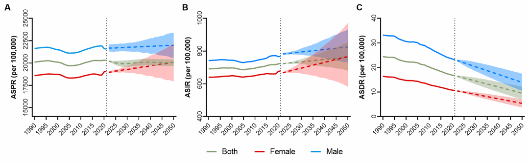 图8. 1990年至2021年全球慢性肝病的ASPR、ASIR和ASDR,并预测至2050年,总体以及按性别分组
