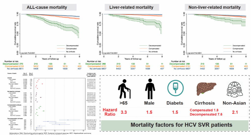 研究显示DAA-SVR患者在死亡率与治疗前肝病严重程度密切相关,年龄、性别、基线糖尿病、种族、地区与HCV治愈后死亡风险相关。研究结果将为精准医学提供了精细的亚组数据,以支持个性化护理、未来的建模研究以及公共卫生规划。
