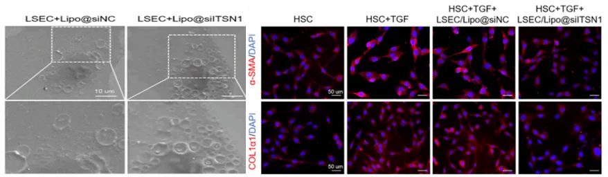 研究显示ITSN1是影响LSECs分化表型的关键分子,使用防御素递送的ITSN1siRNA靶向LSECs可恢复LSECs的窗孔结构,具有逆转肝纤维化的潜力。