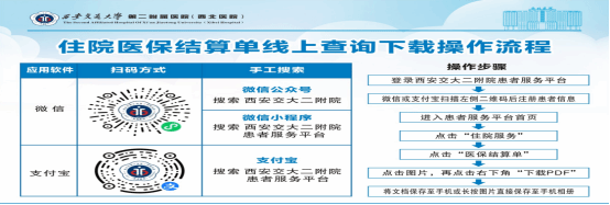 1.操作流程:出院医保结算后,患者用手机直接登录“西安交大二附院患者服务平台”或通过微信/支付宝扫描医院二维码登录,进入患者服务平台,按照操作流程,便可在手机端及时查询并下载“住院医保结算单”至手机,方便患者随时查看医保报销明细。